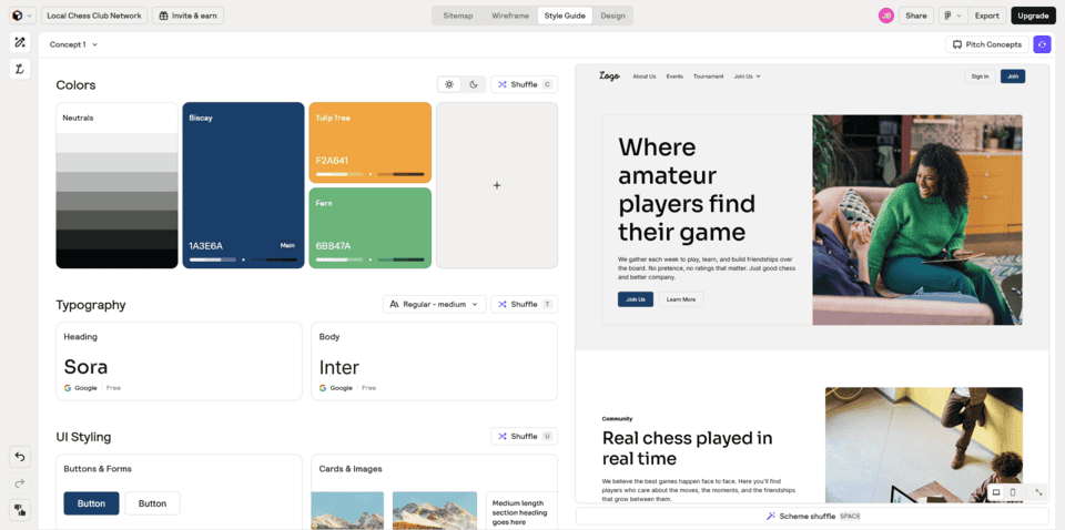 Unlike Figma, the AI generated images were not chess related and, although the text was about chess, it seemed quite cheesy. But then I’d have replaced all the AI content anyway. The overall look was clean and slick, but felt a bit corporate.